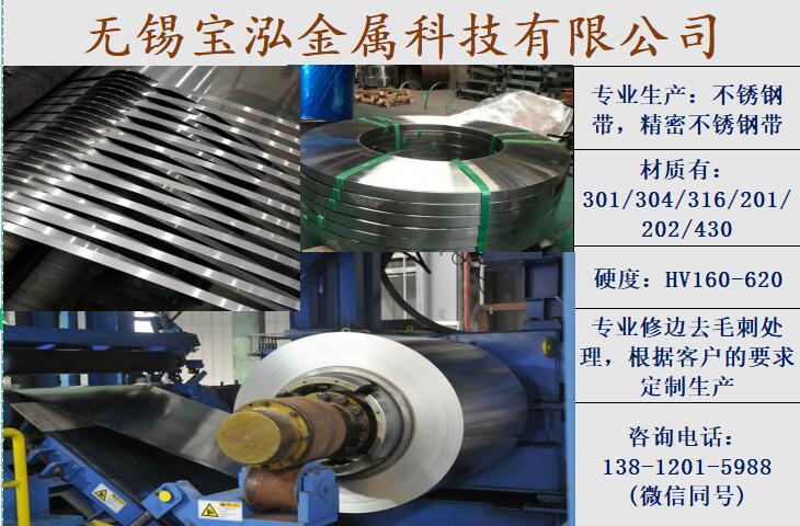 无锡宝泓金属科技有限公司位于美丽的无锡市锡山区东北塘街道东亭北路68号。我们公司主营:301精密不锈钢带、304精密不锈钢带、316精密不锈钢带、201精密不锈钢带,高硬度不锈钢带,原材料卷对卷连续表面处理。可根据客户要求对材料表面粗糙度,光泽度,颜色及电气化特性进行相应的开发等。 公司有十五年的生产经验,原材料全部选用国内知名母材使材料的性能更加稳定。本公司配套设备:精密20棍轧机及拉角机和清洗设备材料使表面及版型得到质量把控,在分条及修边也是选用德国进口设备材料的毛刺也很光滑材料性能提升。不锈钢板材的开平及贴膜及表面处理我公司也一套完善的设备。公司秉承"为顾客服务,勇攀高峰"的经营理念,坚持"诚实守信"的原则为广大客户提供周到的服务。秉持以技术创新为主导,不断推出前沿高新技术、设计制造高品质产品、不断夯实基础、提升核心竟争力.?坚持以“品质赢得信赖,创新谋求发展”为我们稳健经营理念和宗旨,用良好的“品质”“服务”“交期”“价格”争取广大客户认可,成为客户选择我司的材料配套商,来获得客户的长期仰赖与支持!?我们竭诚欢迎国内外客商莅临指导,洽谈合作,让我们携手共进,共创美好未来!